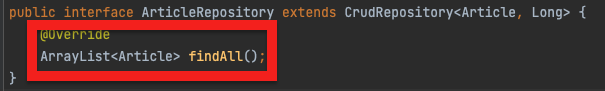 이때, 리파지토리의 타입을 리스트로 가져오기 위해, 리파지토리 인터페이스 코드를 수정한다.