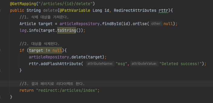 RedirectAttributes.addFlashAttributes("msg","deleted!")