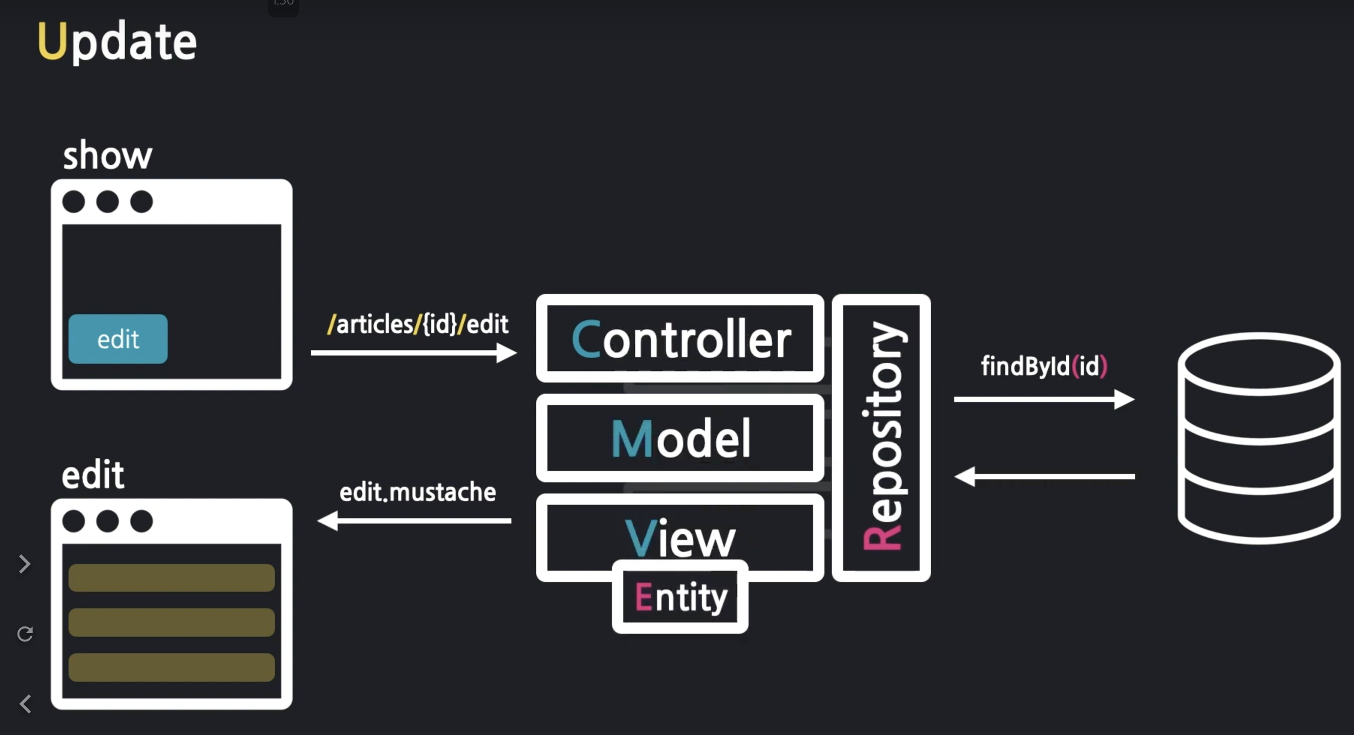 1. show.mustache 에 edit 버튼( a 태그) 를 추가한다.