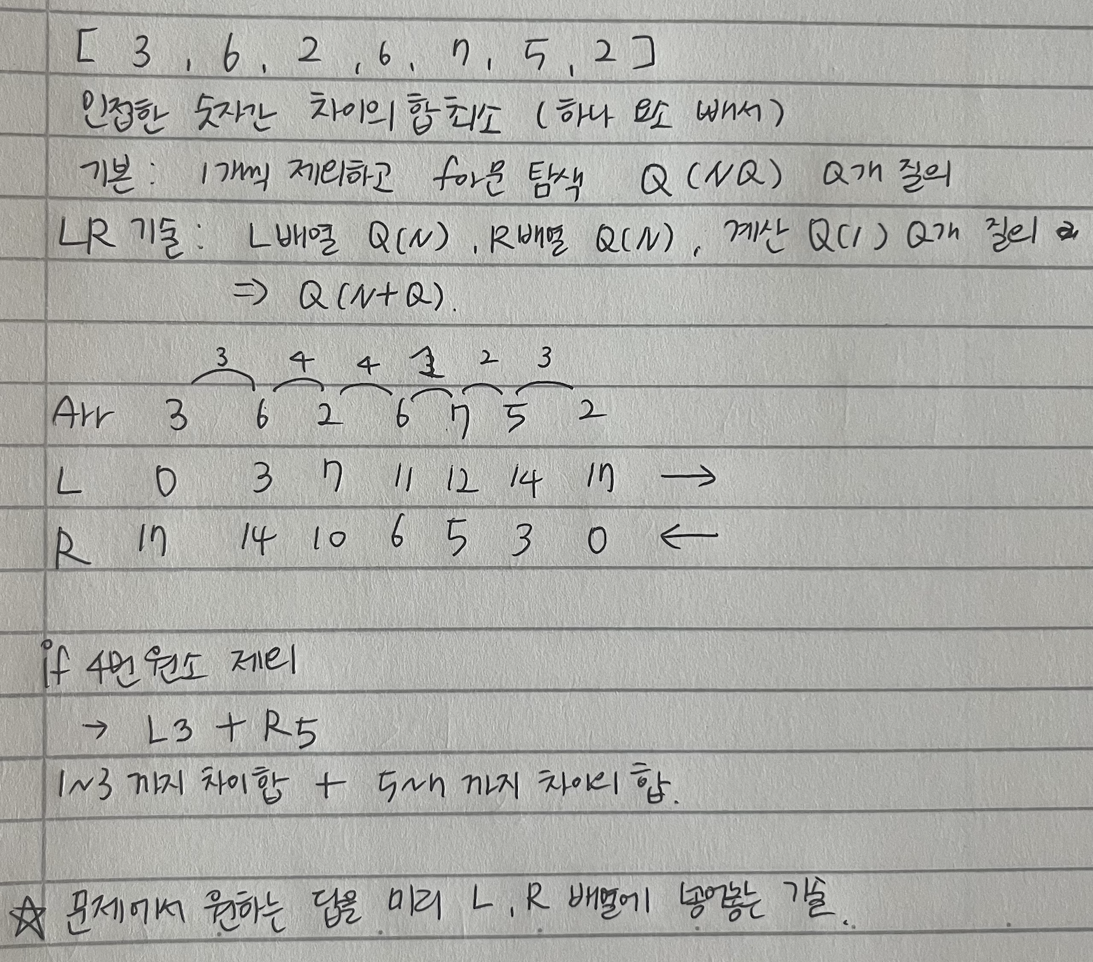 - 마지막에 L[i-1]+R[i+1] 에 i-1 → i+1로 가는 길이를 더해주는 것이 포인트