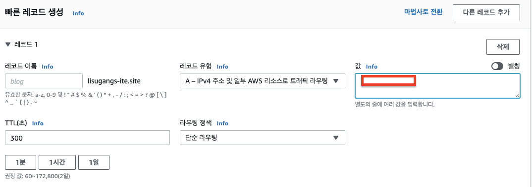 호스팅 영역 생성하기에서 도메인 이름에 구입한 도메인 명을 넣는다. (설명 추가는 옵션이다.)