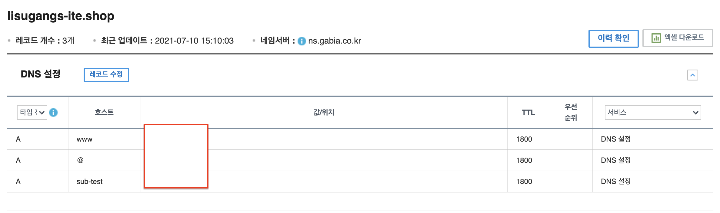 호스트 - www, @, 임의로 하나더 (sub-test) 를 생성해준다.