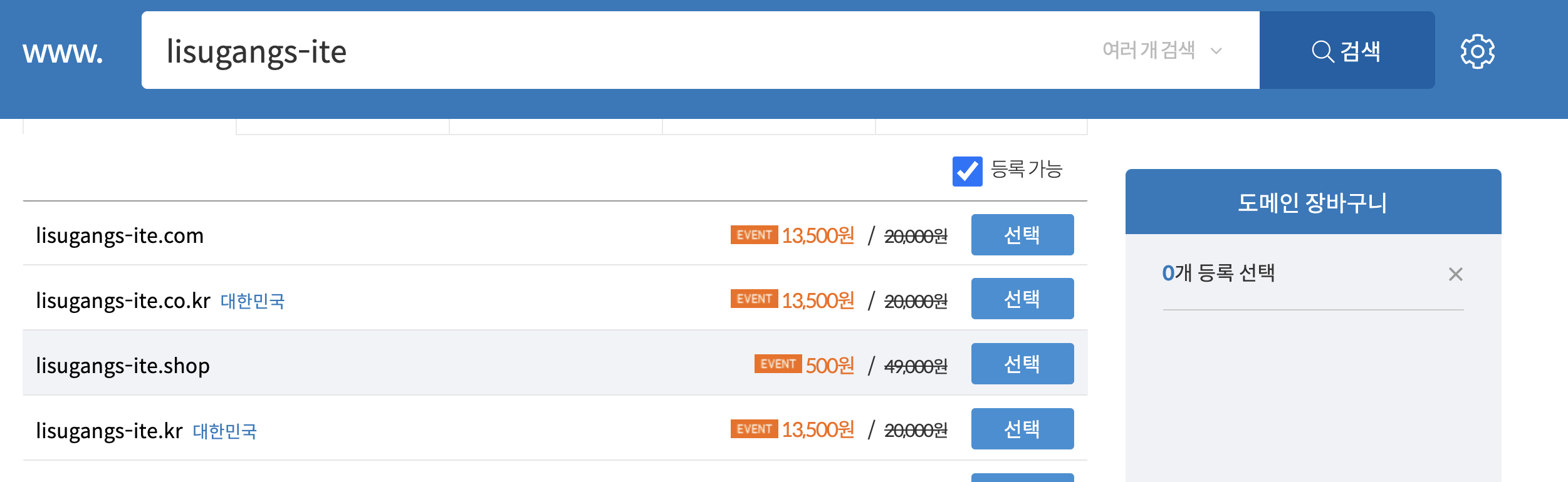 원하는 도메인 네임을 이용하여 확인 후 구매진행